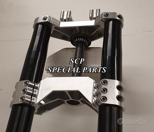 Kit costituito da: FORCELLE YAMAHA R1 con stelo da 43 mm, forcelle ALLESTITE e MODIFICATE SPECIFICATAMENTE per K 100. Le forcelle sono corredate da piedini radiali speciali ricavati dal pieno su misura e pinze BREMBO radiali con dischi brembo da 320mm. Piastre di sterzo speciali ricavate dal pieno e sovradimensionate con piastra inferiore da 80 mm a 3 punti di chiusura e cava di alleggerimento laterale passante. Piastra di sterzo superiore con alleggerimenti e riser per manubrio naked. Disponibili anche semimanubri ricavati dal pieno. Staffe parafango ricavate dal pieno con parafango carbonio e kit perno ruota ricavato dal pieno. Per il montaggio si utilizzano boccole e cuscinetti originali BMW. Tutte le parti ricavate dal pieno possono essere anodizzate di qualsiasi colore. Possiamo progettare e realizzare qualsiasi modifica su richiesta. Sulle piastre possiamo replicare attacchi e supporti originali per telaietto, quadro strumenti, blocco accensione, blocca sterzo, ammortizzatore di sterzo etc oppure possiamo farne di nuovi su richiesta.