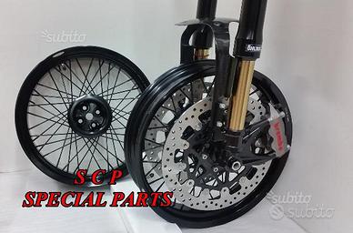 Kit costituito da: FORCELLE OHLINS R&T 43 con stelo da 43 mm e fodero da 54mm, forcelle ALLESTITE SPECIFICATAMENTE PER K 100. Le forcelle sono corredate da piedini radiali speciali ricavati dal pieno e pinze BREMBO radiali m4 con dischi brembo da 320mm. Piastre di sterzo speciali ricavate dal pieno e sovradimensionate con piastra inferiore da 80 mm a 3 punti di chiusura e cava di alleggerimento laterale passante. Piastra di sterzo superiore con alleggerimenti e kit manubri sportivi ricavati dal pieno. Staffe parafango ricavate dal pieno con parafango carbonio e kit perno ruota ricavato dal pieno. Staffe supporto ricavate dal pieno per faro speciale. Per il montaggio si utilizzano boccole e cuscinetti originali. Tutte le parti ricavate dal pieno possono essere anodizzate di qualsiasi colore. Possiamo progettare e realizzare qualsiasi modifica su richiesta. Sulle piastre possiamo replicare attacchi e supporti originali per telaietto, quadro strumenti, blocco accensione, blocca sterzo, ammortizzatore di sterzo etc oppure possiamo farne di nuovi su richiesta come in questo caso in cui è stato intallato uno strumento digitale affogato dentro la piastra. Possiamo fornire come optional: cerchi a raggi su misura SIA DA 17 CHE DA 18 POLLICI, dischi e pinze brembo, parafango carbonio, piastre con off set regolabile.