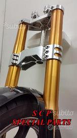 Kit costituito da: Forcelle ohlins, piedini radiali speciali per utilizzare il cerchio originale, doppio disco Brembo con flange di supporto per mozzo cerchio originale, pinze radiali brembo, piastre di sterzo speciali ricavate dal pieno e sovradimensionate con piastra inferiore da 80 mm a 3 punti di chiusura con cave di alleggerimento passanti e piastra superiore completa di riser. Semimanubri disponibili a richiesta. Possiamo realizzare attacchi o supporti per blocco accensione, amm. di sterzo, blocca sterzo, strumentazioni etc...Tutto il kit è assolutamente plug & play ovvero si monta senza modifiche . Per il montaggio si utilizzano boccole e cuscinetti originali. Tutte le parti ricavate dal pieno possono essere anodizzate di qualsiasi colore. Possiamo progettare e realizzare qualsiasi specifica atta a rendere unica tale tipologia di prodotto. Tutte le parti ricavate dal pieno possono essere progettate e realizzate direttamente su specifiche tecniche ed estetiche del cliente. Con i nostri kit potete modificare e/o sostituire l'avantreno di qualsiasi moto e renderla unica. Le forcelle sono appositamente modificate per essere perfettamente compatibili con la moto. Il kit può essere realizzato sia per Iil cerchio originale sia per cerchio speciale. Possiamo fornire come optional: cerchi Oz, Dymag, Pvm, dischi e pinze freno brembo, parafango carbonio, off set regolabile delle piastre. Progettiamo e Realizziamo avantreni speciali per cafe racer, scrambler, streetfighter, superbike, prototipi. Possiamo anche realizzare per qualsiasi moto kit piastre speciali e kit di montaggio (perno ruota , boccole etc) anche per forcelle e cerchi di qualsiasi tipologia, forniti dal cl