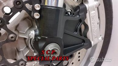 Progettiamo e Realizziamo avantreni speciali per qualsiasi moto completi di forcelle OHLINS e impianti frenanti BREMBO, oppure PROTOTIPIAMO KIT SPECIFICI di montaggio per forcelle e impianti frenanti di QUALSIASI altra marca ma fornite dal cliente. PRESENTIAMO AVANTRENO BMW K 100 ALLESTITO CON FORCELLE EX DUCATI MULTISTRADA, IMPIANTO FRENANTE BREMBO, CERCHIO BMW. PER INSTALLARE LE FORCELLE DUCATI E IL RESTO DELLE PARTI DESCRITTE ABBIAMO PROTOTIPATO E REALIZZATO UN KIT SPECIFICO RICAVATO DAL PIENO, COSTITUITO DA: PIASTRE DI STERZO RICAVATE DAL PIENO SU MISURA, KIT PERNO RUOTA, FLANGE CERCHIO, STAFFE PARAFANGO E LA COPPIA DI PIEDINI RADIALI PER LE FORCELLE DUCATI (in origine erano assiali). SICUREZZA, GUIDABILITA', CONFORT, ESCLUSIVITA' ED ESTETICA AI MASSIMI LIVELLI! IL KIT E' PLUG AND PLAY! SI MONTA SENZA NESSUNA MODIFICA! ANCHE CON CERCHIO ORIGINALE. Kit costituito da: FORCELLE MULTISTRADA, forcelle ALLESTITE e MODIFICATE SPECIFICATAMENTE per BMW K 100. Le forcelle sono corredate da piedini radiali RICAVATI. Piastre di sterzo speciali ricavate dal pieno e sovradimensionate con piastra inferiore da 80 mm a 3 punti di chiusura alleggerite CON CAVE LATERALI. Piastra di sterzo superiore a 2 punti di chiusura con alleggerimenti PREDISPOSTE per semimanubri ricavati dal pieno. LE PIASTRE POSSONO AVERE TUTTI GLI ATTACCHI PRESENTI SULLE ORIGINALI OPPURE POSSIAMO FARE ATTECCHI SU MISURA. Per il montaggio si utilizzano boccole e cuscinetti originali BMW. Tutte le parti ricavate dal pieno possono essere anodizzate di qualsiasi colore. Possiamo progettare e realizzare qualsiasi modifica su richiesta. Sulle piastre possiamo replicare attacchi e supporti originali per telaietto, quadro strumenti, blocco accensione, blocca sterzo, ammortizzatore di sterzo etc oppure possiamo farne di nuovi su richiesta. Possiamo fornire come optional: cerchi a raggi cerchi forgiati marchesini oz dymag pvm, impianti frenanti brembo.