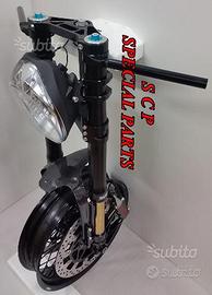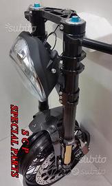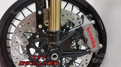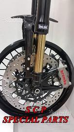 Kit costituito da: FORCELLE OHLINS R&T 43 con stelo da 43 mm e fodero da 54mm, forcelle ALLESTITE SPECIFICATAMENTE PER K 100. Le forcelle sono corredate da piedini radiali speciali ricavati dal pieno e pinze BREMBO radiali m4 con dischi brembo da 320mm. Piastre di sterzo speciali ricavate dal pieno e sovradimensionate con piastra inferiore da 80 mm a 3 punti di chiusura e cava di alleggerimento laterale passante. Piastra di sterzo superiore con alleggerimenti e kit manubri sportivi ricavati dal pieno. Staffe parafango ricavate dal pieno con parafango carbonio e kit perno ruota ricavato dal pieno. Staffe supporto ricavate dal pieno per faro speciale. Per il montaggio si utilizzano boccole e cuscinetti originali. Tutte le parti ricavate dal pieno possono essere anodizzate di qualsiasi colore. Possiamo progettare e realizzare qualsiasi modifica su richiesta. Sulle piastre possiamo replicare attacchi e supporti originali per telaietto, quadro strumenti, blocco accensione, blocca sterzo, ammortizzatore di sterzo etc oppure possiamo farne di nuovi su richiesta come in questo caso in cui è stato intallato uno strumento digitale affogato dentro la piastra. Possiamo fornire come optional: cerchi a raggi su misura, dischi e pinze brembo, parafango carbonio, piastre con off set regolabile.