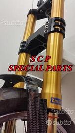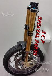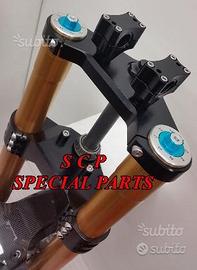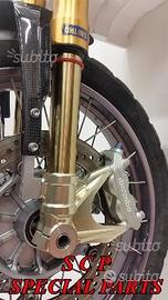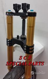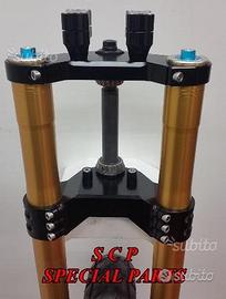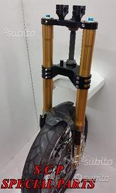 PROTOTIPIAMO E REALIZZIAMO AVANTRENI SPECIALI COMPLETI PER QUALSIASI MOTO. PRESENTIAMO AVANTRENO COMPLETO PER BMW K1100RS CON FORCELLE OHLINS DA 54mm, PIASTRE DI STERZO RICAVATE DAL PIENO SPECIALI, PIEDINI RADIALI RICAVATI DAL PIENO SPECIALI PER PINZE BREMBO RADIALI E CERCHIO DA 19 O 21. IL KIT E' PLUG AND PLAY! SPECIFICO! SI MONTA SENZA NESSUNA MODIFICA! Kit costituito da: Forcelle OHLINS R&T 43 con con stelo da 43 mm e fodero da 54mm, le forcelle sono modificate SPECIFICATAMENTE NELLA CORSA, LUNGHEZZA E TARATURA per k1100rs. le forcelle sono corredate da piedini radiali speciali ricavati dal pieno e pinze BREMBO radiali, piastre di sterzo speciali ricavate dal pieno e sovradimensionate con piastra inferiore da 60 mm a 3 punti con cave di alleggerimento passanti. Riser ricavati dal pieno con altezza standard regolabili nel diametro e nella altezza della posizione di guida. Staffe parafango ricavate dal pieno con parafango in carbonio e kit perno ruota ricavato dal pieno. Per il montaggio si utilizzano boccole e cuscinetti originali. Il cerchio è da 19 ex bmw r1100gs. Tutte le parti ricavate dal pieno possono essere anodizzate di qualsiasi colore. Possiamo progettare e realizzare qualsiasi specifica atta a rendere unica tale tipologia di prodotto. Tutte le parti ricavate dal pieno possono essere progettate e realizzate direttamente su specifiche tecniche ed estetiche del cliente. Sulle piastre possiamo replicare attacchi e supporti originali per telaietto, quadro strumenti, blocco accensione, blocca sterzo, ammortizzatore di sterzo etc oppure possiamo farne di nuovi su richiesta. Possiamo fornire come optional: cerchi a raggi su misura oppure forgiati a razze, cerchi Oz, Dymag, Pvm, dischi e pinze brembo, parafango carbonio, off set regolabile delle piastre. Progettiamo e Realizziamo avantreni speciali completi con forcelle ohlins per: cafe racer, scrambler, streetfighter, superbike, prototipi, show bike, maxi enduro, off road, special etc...