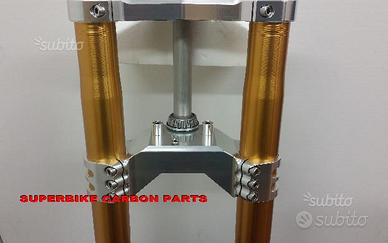 Kit costituito da: Forcelle ohlins, piedini radiali speciali ricavati dal pieno, piastre di sterzo speciali ricavate dal pieno sovradimensionate con piastra inferiore ad "ala di gabbiano" da 80 mm a 3 punti di chiusura con cave di alleggerimento passanti e piastra superiore con riser, asse canotto con blocca sterzo . Tutto il kit è assolutamente plug & play ovvero si monta senza modifiche ed è progettato specificatamente per tutte le BMW K 100 MA POSSIAMO REALIZZARLO PER QUALSIASI MOTO. Per il montaggio si utilizzano boccole e cuscinetti originali. Tutte le parti ricavate dal pieno possono essere anodizzate di qualsiasi colore. Tutti gli accessori menzionati sono nuovi. Possiamo progettare e realizzare qualsiasi specifica atta a rendere unica tale tipologia di prodotto. Tutte le parti ricavate dal pieno possono essere progettate e realizzate direttamente su specifiche tecniche ed estetiche del cliente. Con i nostri kit potete modificare e/o sostituire l'avantreno di qualsiasi moto e renderla unica. Progettiamo e realiziamo un avantreno completo di tutte le parti. Le forcelle sono appositamente modificate per essere perfettamente compatibili con il tipo di moto. Potete utilizzare qualsiasi cerchio e dischi freno. Il kit può essere realizzato sia per pinze radiali sia per pinze ad attacco assiale o perimetrale (vedi Buell o alcune Harley Davidson). I nostri kit avantreni speciali si montano senza dover effettuare alcun adattamento. Possiamo fornire come optional: cerchi Oz, Dymag, Pvm, dischi e pinze freno brembo, parafango carbonio, off set regolabile delle piastre. Progettiamo e Realizziamo avantreni speciali per cafe racer, scrambler, streetfighter, superbike, prototipi. Possiamo realizzare per qualsiasi moto il kit piastre speciali e il kit di montaggio (perno ruota , boccole etc) anche per forcelle e cerchi di qualsiasi tipologia, forniti dai clienti.