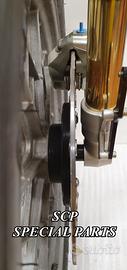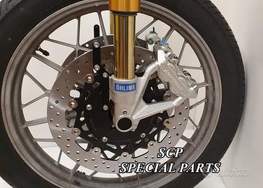 Kit costituito da: FORCELLE OHLINS R&T 43 con stelo da 43 mm e fodero da 56mm, forcelle ALLESTITE SPECIFICATAMENTE PER BMW SERIE R. Le forcelle sono corredate da piedini radiali e pinze BREMBO radiali con dischi brembo da 320mm INSTALLATI SU FLANGE MOZZO RICAVATE DAL PIENO SPECIFICHE . Piastre di sterzo speciali ricavate dal pieno e sovradimensionate con piastra inferiore da 60 mm a 3 punti di chiusura ( disponibili anche con alleggerimenti laterali ). Piastra di sterzo superiore e kit manubri sportivi ricavati dal pieno. Staffe parafango ricavate dal pieno con parafango carbonio e kit perno ruota ricavato dal pieno. Flange mozzo cerchio ricavate dal pieno per dischi brembo. Per il montaggio si utilizzano boccole e cuscinetti originali. Tutte le parti ricavate dal pieno possono essere anodizzate di qualsiasi colore. Possiamo progettare e realizzare qualsiasi modifica su richiesta. Sulle piastre possiamo replicare attacchi e supporti originali per telaietto, quadro strumenti, blocco accensione, blocca sterzo, ammortizzatore di sterzo etc oppure possiamo farne di nuovi su richiesta come in questo caso in cui è stato intallato uno strumento digitale affogato dentro la piastra.
