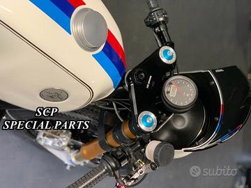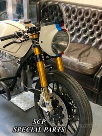 Kit costituito da: FORCELLE OHLINS R&T 43 con stelo da 43 mm e fodero da 56mm, forcelle ALLESTITE SPECIFICATAMENTE PER BMW SERIE R. Le forcelle sono corredate da piedini radiali e pinze BREMBO radiali con dischi brembo da 320mm INSTALLATI SU FLANGE MOZZO RICAVATE DAL PIENO SPECIFICHE . Piastre di sterzo speciali ricavate dal pieno e sovradimensionate con piastra inferiore da 60 mm a 3 punti di chiusura ( disponibili anche con alleggerimenti laterali ). Piastra di sterzo superiore e kit manubri sportivi ricavati dal pieno. Staffe parafango ricavate dal pieno con parafango carbonio e kit perno ruota ricavato dal pieno. Flange mozzo cerchio ricavate dal pieno per dischi brembo. Per il montaggio si utilizzano boccole e cuscinetti originali. Tutte le parti ricavate dal pieno possono essere anodizzate di qualsiasi colore. Possiamo progettare e realizzare qualsiasi modifica su richiesta. Sulle piastre possiamo replicare attacchi e supporti originali per telaietto, quadro strumenti, blocco accensione, blocca sterzo, ammortizzatore di sterzo, faro oppure possiamo farne di nuovi su richiesta .