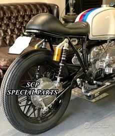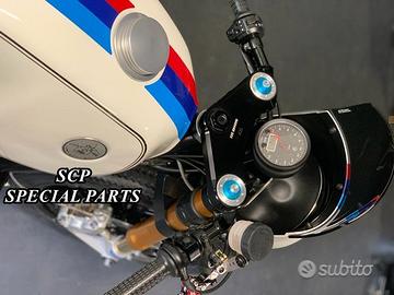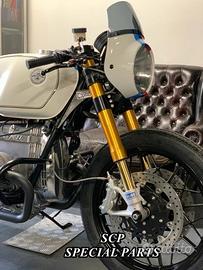 Progettiamo e Realizziamo avantreni speciali con forcelle ohlins su misura per: cafe racer, scrambler, streetfighter, superbike, prototipi, show bike, maxi enduro, off road, custom. PRESENTIAMO AVANTRENO COMPLETO SPECIFICO PER BMW R 100 CS ( DISPONIBILE ANCHE PER R 90 R 80 R 75 R 60 K100 K 75 E PER QUALSIASI ALTRA MOTO), CON FORCELLE OHLINS ALLESTITE SU MISURA, PIASTRE DI STERZO RICAVATE DAL PIENO SU MISURA, SEMIMANUBRI RICAVATI DAL PIENO, DISCHI BREMBO MAGGIORATI DA 320MM E PINZE BREMBO RADIALI SU CERCHIO ORIGINALE BMW. SICUREZZA, GUIDABILITA', CONFORT, ESCLUSIVITA' ED ESTETICA TOP! IL KIT E' PLUG AND PLAY! SI MONTA SENZA NESSUNA MODIFICA! ANCHE CON CERCHIO ORIGINALE BMW. Kit costituito da: FORCELLE OHLINS R&T 43 con stelo da 43 mm e fodero da 56mm, forcelle ALLESTITE SPECIFICATAMENTE PER BMW SERIE R. Le forcelle sono corredate da piedini radiali e pinze BREMBO radiali con dischi brembo da 320mm INSTALLATI SU FLANGE MOZZO RICAVATE DAL PIENO SPECIFICHE . Piastre di sterzo speciali ricavate dal pieno e sovradimensionate con piastra inferiore da 60 mm a 3 punti di chiusura ( disponibili anche con alleggerimenti laterali ). Piastra di sterzo superiore e kit manubri sportivi ricavati dal pieno. Staffe parafango ricavate dal pieno con parafango carbonio e kit perno ruota ricavato dal pieno. Flange mozzo cerchio ricavate dal pieno per dischi brembo. Per il montaggio si utilizzano boccole e cuscinetti originali. Tutte le parti ricavate dal pieno possono essere anodizzate di qualsiasi colore. Possiamo progettare e realizzare qualsiasi modifica su richiesta. Sulle piastre possiamo replicare attacchi e supporti originali per telaietto, quadro strumenti, blocco accensione, blocca sterzo, ammortizzatore di sterzo, faro oppure possiamo farne di nuovi su richiesta . Possiamo fornire come optional: cerchi a raggi su misura SIA DA 17 CHE DA 18 E 19 POLLICI moto allestita garage221