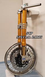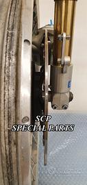 FORCELLE OHLINS, AMMORTIZZATORI OHLINS, PIASTRE DI STERZO RICAVATE DA PIENO SU MISURA, DISCHI BREMBO MAGGIORATI DA 320MM, PINZE BREMBO RADIALI, PARAFANGO CARBONIO.