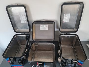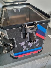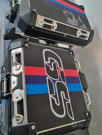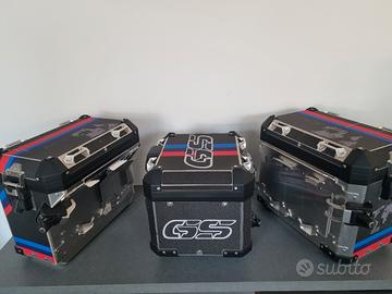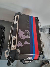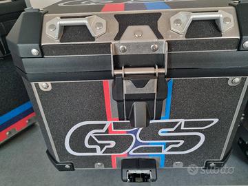 per bmw r1200gs e r1250gs dal 2013 in poi vendo coppia valigie laterali e top case bauletto originali bmw motorrad con grafiche dedicate alla versione rallye utilizzate poco e ben tenute. Il top case è completo di schienalino originale e le 8 serrature sono eventualmente codificabili con chiave della vostra moto al momento della consegna.