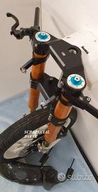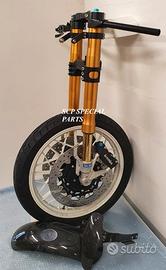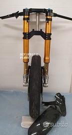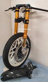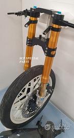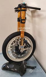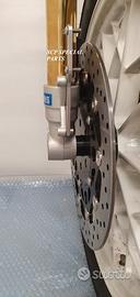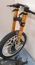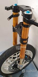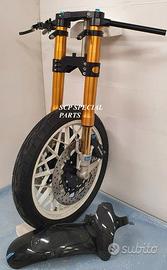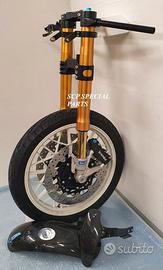 Progettiamo e Realizziamo avantreni speciali con forcelle ohlins e freni brembo, su misura per: cafe racer, scrambler, custom, streetfighter, superbike, prototipi, show bike, maxi enduro, off road, maxi scooter, brat. ESCLUSIVITA', PERFORMANCE, SICUREZZA ED ESTETICA AL TOP! PRESENTIAMO AVANTRENO SU MISURA PER BMW SERIE R E SERIE K ( su richiesta anche per qualsiasi altro modello), costituito da: - FORCELLE OHLINS allestite su misura in base al progetto, disponibili nel modello R&T NIX con stelo da 48mm e fodero da 58mm oppure OHLINS NIX SUPERBIKE, oppure R&T stelo da 43mm fodero da 56mm (quelle in foto) oppure OHLINS TRADIZIONALI NON ROVESCIATE) - PIEDINI FORCELLE RADIALI, su richiesta anche ricavati dal pieno con macchinari cnc - KIT PIASTRE DI STERZO RICAVATE DAL PIENO SU MISURA - STAFFE SUPPORTO FARO E SUPPORTI CRUSCOTTO RICAVATE DAL PIENO - RISER MANUBRIO OPPURE COPPIA SEMIMANUBRI RICAVATI DAL PIENO - PINZE BREMBO RADIALI (vari mod. disp.) - DISCHI BREMBO MAGGIORATI da 320mm - PARAFANGO CARBONIO - PERNO RUOTA, FLANGE MOZZO E STAFFE PARAFANGO TUTTO RICAVATO DAL PIENO Optional: - COPPIA CERCHI RAGGI - AMMORTIZZATORE POST. OHLINS - POMPA FRENO BREMBO IL KIT MONTA PLUG AND PLAY SENZA MODIFICHE ANCHE CON IL CERCHIO ORIGINALE BMW. Piastre di sterzo speciali ricavate dal pieno e sovradimensionate con piastra inferiore da 80 mm a 3 punti di chiusura con alleggerimenti passanti laterali. Piastra di sterzo superiore con riser oppure kit manubri sportivi ricavati dal pieno. Per il montaggio delle piastre si utilizzano boccole e cuscinetti originali. Tutte le parti ricavate dal pieno possono essere anodizzate di qualsiasi colore. Le forcelle ohlins possono essere fornite con fodero anodizzato oro oppure anodizzato colori su richiesta. Possiamo progettare e realizzare qualsiasi modifica su richiesta. Sulle piastre possiamo replicare attacchi e supporti presenti sul modello originale oppure possiamo realizza