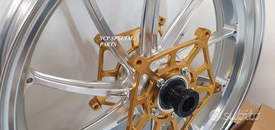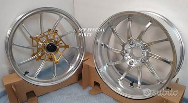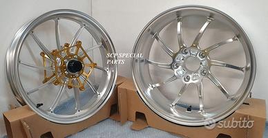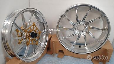 PRESENTIAMO CERCHI RUOTE IN ALLUMINIO FORGIATO PVM A 10 RAZZE SPECIFICI PER: -BMW R NINE T 2014 - 2016 -BMW R NINE T 2017 - 2020 -BMW R NINE T 2021 > -BMW R NINE T PURE 2017 - 2020 -BMW R NINE T PURE 2021 > -BMW R NINE T RACER 2017 - 2020 I CERCHI SONO PLUG AND PLAY SI MONTANO ASSOLUTAMENTE SENZA NESSUNA MODIFICA. DISPONIBILI SU RICHIESTA ANODIZZATI DI QUALSIASI COLORE. Cerchi PVM a 10 razze, realizzati in alluminio forgiato sportversion lightweight. I cerchi sono leggerissimi: soli 8 kg di peso per la coppia pronta da montare! tantissimi kg in meno degli originali! Questo nuovo modello consente di avere la resistenza e robustezza dell'alluminio forgiato abbinato ad un peso comparabile al magnesio. Un peso eccezionale, come i migliori cerchi in magnesio ma con la resistenza dell'alluminio forgiato. La notevole centralizzazione delle masse ottenuta nella realizzazione di questa tipologia di cerchi, abbinata all'estrema leggerezza, fa si che vi sia una diminuzione drammatica dell'effetto giroscopico. Ciò si traduce in cambi di direzione fulminei abbinati alla possibilità di ritardare molto di più la staccata e alla capacità nettamente superiore della moto di tenere la corda e poter disegnare traiettorie molto più strette a netto vantaggio dell'uscita di curva. Si montano plug and play sulla moto senza nessuna modifica. Come optional si possono avere il kit dischi freno realizzati da brembo e le pinze freno brembo.
