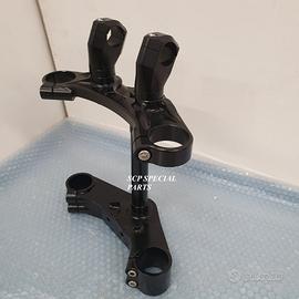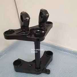 PROTOTIPIAMO E RALIZZIAMO PIASTRE DI STERZO RICAVATE DAL PIENO CON MACCHINARI A CONTROLLO NUMERICO. Presentiamo piastre di sterzo ricavate dal pieno specifiche per: BMW R NINE T SCRAMBLER BMW R NINE T URBAN GS Disponibile su richiesta anche per altri modelli BMW SI MONTANO PLUG AND PLAY SENZA MODIFICHE REALIZZATE SU MISURA PER FORCELLE ORIGINALI BMW OPPURE SU RICHIESTA POSSIAMO PRODURLE PER FORCELLE OHLINS SIA A STELO TRADIZIONALE CHE ROVESCIATO. Il kit piastre realizzato in LEGA è costituito da: piastra di sterzo inferiore, completa di asse canotto e piastra di sterzo superiore con riser. POSSIAMO FORNIRLE ANCHE NELLA VERSIONE SUPERBIKE CON OFFSET REGOLABILE CON ECCENTRICI Replichiamo tutti gli attacchi e supporti presenti sulle piastre originali Possiamo realizzare anche punti di fissaggio e o supporti speciali su richiesta Per il montaggio si utilizzano i cuscinetti originali. Possiamo realizzare cave di alleggerimento anche passanti e altre lavorazioni meccaniche su richiesta. Un prodotto rivoluzionario per efficacia, risorse tecniche. Le piastre di sterzo sono progettate appositamente per migliorare il feeling con l'avantreno eliminando il chattering rendendo la moto molto piu' stabile e granitica in inserimento curva e percorrenza e agile nei cambi di direzione. La lega speciale utilizzata è testata in pista nei principali campionati internazionali e studiata appositamente per permettere alle sospensioni di lavorare molto meglio. Finitura superficiale e anodizzazione di qualsiasi colore a scelta.