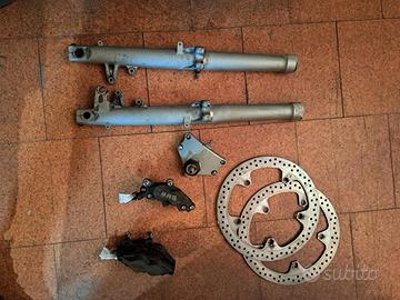 vendo tutto quanto serve per montare freni da 320 e pinze più grandi e moderne per i modelli bmw R1100GS e R1150GS. Se viaggiate in due e/o carichi o vi piace avere più potenza di frenata all’anteriore sono l’ideale per mantenere originalità nelle parti. Naturalmente funzionano sia con o senza ABS. Tutto materiale in ordine non proveniente da moto incidentata ma che avevo montato sulla mia che ho rimesso originale per la vendita Il kit contiene i foderi che abbinerete ai Vs steli, i dischi da 320 le pinze BMW dei modelli seguenti e lo snodo centrale . Gli steli sono semplicemente infilati nei foderi quindi non ci sono forcelle da aprire, chiavi speciali od altre lavorazioni complicate, basta tenerli dritti perché non esca l’olio (se magari con l’occasione non volete cambiarlo!!) ed in un minuto è fatto. Anche le ruote sono tutte uguali e basta sostituire i dischi. Praticamente è tutto plug and play e si fa la sostituzione in poco tempo mantenendo le parti originali intatte per un eventuale rimontaggio. Grazie, carlo