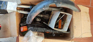 Forcelle, pinze freno Brembo con pastiglie nuove, canotto sterzo, piastra superiore ed inferiore, sterzo originale, riser, Strumentazione contagiri e contachilometri, pompa freno anteriore, leve, staffe portapacchi, carene fiancatine Laterali, sella originale BMW k100 RS marrone.