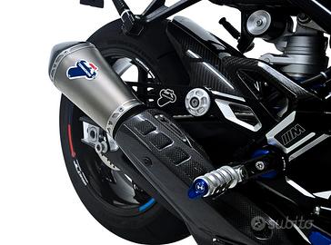 Corpo del silenziatore compatto costruito in acciaio inox e camicia titanio per risparmio di peso. Pensato per mantenere intatta la Track Identity della hypernaked BMW e dare ancora più respiro alle linee della moto.