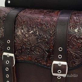 bisaccia in pelle ingrassata con patta in cuoio flowers.
