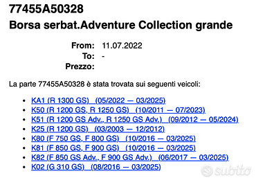Causa doppio regalo vendo borsa da serbatoio BMW MOTORRAD misura grande (11-16 lt) NUOVA, ancora con il cartellino attaccato, serie “Adventure Collection” ref. 77455A50328 completa di spallacci (per trasformarla in zaino) e cinghie per utilizzo sulla sella. La vendo SENZA ATTACCHI MOTO, dato che ogni modello compatibile necessita dei suoi attacchi specifici, venduti separatamente dalla borsa (vedi nelle foto i modelli compatibili). Spedizione gratuita tracciabile.