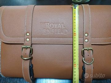 Bellissima borsa laterale in cuoio marrone marca Royal Enfield misure: 11 cm di larghezza altezza 25 cm e lunghezza 43 cm dotata di attacchi nella parte posteriore per essere fissata sia ai lati che posteriormente intenri in rosso flocccato,formula vista e piaciuta
