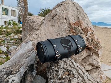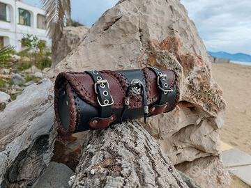 la borsa è realizzata in vera pelle di 3-4 mm di spessore. dotata di un ulteriore rinforzo in plastica all'interno. dispone di cinghie per l'installazione. dimensioni 250*100 mm o 300*100 mm.