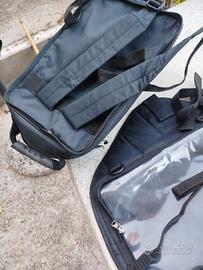 Borsa per serbatoio. ha una base magnetica e cinghie di sicurezza. la borsa si fissa alla base con una cerniera. la borsa è a soffietto per diverse capacità di carico. tolta dalla base diventa borsa con maniglia oppure zaino