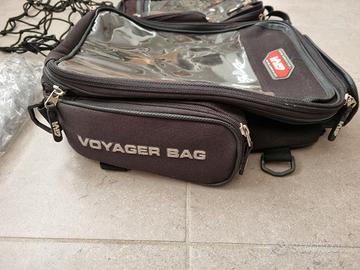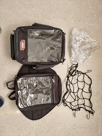 Vendo borsa da serbatoio moto componibile della Givi, composta da due borse , una più piccola , che si attacca al serbatoio con la calamità, e una più grande che si aggancia , mediante cerniera all'altra, entrambe le borse con tasca superiore trasparente. il kit è composto inoltre da protezione trasparente impermeabile antipioggia, cinghie elastiche di fissaggio alla moto , tracolla e rete elastica per ulteriori bagagli.