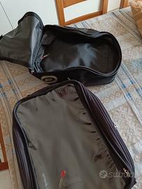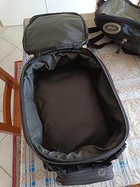 Borsa serbatoio Givi, molto capiente anche se non ricordo esattamente la dimensione in LT. È composta da due pezzi, staccabili tramite cerniera, espandibile, la parte superiore diventa un pratico zainetto da portarsi in giro.