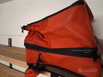 Borsa Serbatoio Moto TEXPORT Vintage Anni '90 - Made in Italy Borsa da serbatoio universale originale TEXPORT, prodotta in Italia negli anni '90. Un accessorio iconico per amanti del genere vintage e moto Youngtimer. Caratteristiche: Componibile: Divisibile in due parti tramite zip (può essere usata sottile o a pieno carico). Porta-cartina: Ampia tasca superiore trasparente per mappe o documenti. Materiale: Tessuto tecnico ultra-resistente rosso e nero. Stato: Buone condizioni generali, zip perfettamente funzionanti. La base è in gommapiuma Compatibilità: Ideale per moto da turismo, enduro stradali e naked anni 80/90/2000.