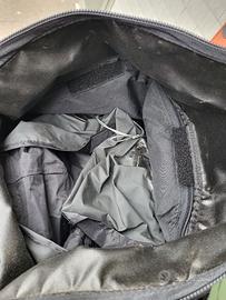 può contenere un casco e si trasforma facilmente in sacca trasportabile a piedi. Espandibile (doppia cerniera) , è dotata di copertura antipioggia come da foto.