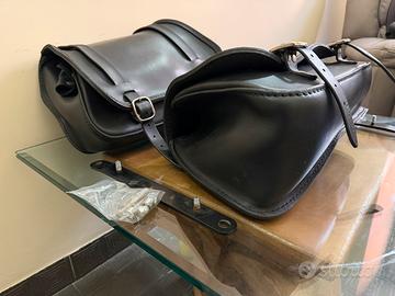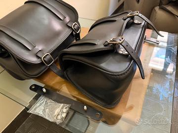 Borse laterali (lati destro e sinistro), disegnate e prodotte dalla ditta Ends Cuoio, il marchio italiano di eccellenza per le borse in cuoio da moto. Prodotto usato poco tempo. Le borse, eleganti, resistenti e capienti, sono state mantenute in ottimo stato. Si vendono insieme agli accessori per l’installazione.