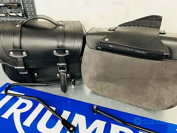 Coppia di borse in ecopelle nera piu supporti borse specifici per Triumph Legend Thunderbird e Adventurer (adattabili anche su altre Triumph tipo Bonneville Scrambler o Thruxton) in perfetto stato.. Pari al nuovo usate solo un paio di volte, molto capienti e con l’attacco centrale a bisacca..