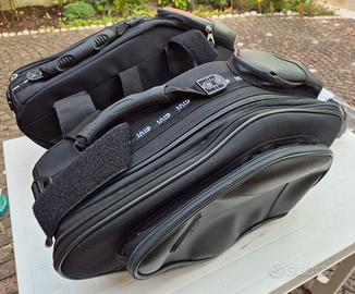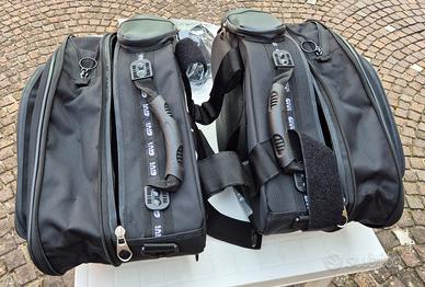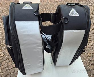 Vendo coppia di borse laterali espandibili da moto e scooter Givi modello T431, colore nero. Studiate principalmente per moto sportive e naked, hanno una capienza che può variare da 19 a 25 litri ognuna. Sono dotate di diverse tasche aggiuntive applicate e ben rifinite. Si fissano con facilità su moto e scooter grazie alle cinghie regolabili con velcro ed ai cavi elastici forniti in dotazione. Un soffietto laterale, azionato da una zip, vi permetterà di regolarne il volume. Completamente impermeabili con zip stagne. Dotate di protezioni per il calore delle marmitte.