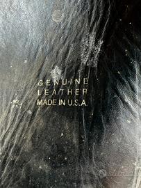 Set di borse laterali vintage per moto Harley-Davidson. Sono in pelle nera. Belli i rivetti e le decorazioni color argento. Hanno un disegno di aquila sui lembi in pelle. Marchiate "Genuine Leather Made in USA" sui lati. Le borse misurano circa 40 cm di lunghezza, 33 cm dall'alto in basso e 15 cm di larghezza. Hanno un paio di cinghie da riparare e qualche foro ma per il resto, la pelle è buona... cinghie e fibbie sono presenti. Esattamente come le ho trovate. Viste e piaciute.