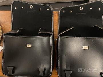 Come da titolo vendo 2 borse laterali moto nere in similpelle universali nuovissime mai usate, con attacco sottosella e porta borraccia staccabile.