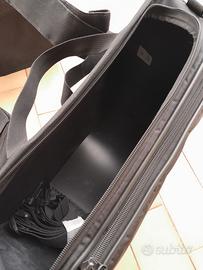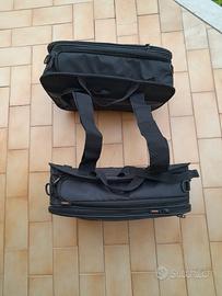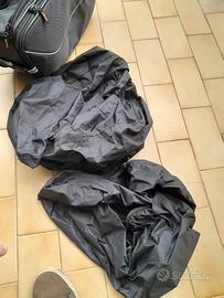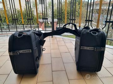 Borse laterali per scooter complete di tracolla, copertura antipioggia e gancio elastico per fissaggio al ciclomotore. Vanno fissate unendo sotto sella le cinghie a strapp. Dimensioni: lunghezza 45 cm altezza 26 cm larghezza 15 cm CONDIZIONI PERFETTE!