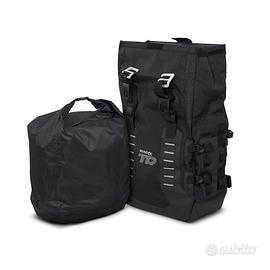 Set di borse laterali TR40 adventure disegnate a Barcellona con una capacità fino a 64 litri. Realizzate in materiale ultra resistente all'abrasione che garantisce l'impermeabilità grazie alla combinazione del roll-up pieghevole più la borsa interna. Double Locking System (in attesa di brevetto) per bloccare la borsa sul fissaggio 4P e impedire l'accesso all'interno della borsa. Le borse adventure TR40 sono state progettate a Barcellona e hanno una capacità di 32 litri e una capacità di carico fino a 10 kg ciascuna. Le borse adventure TR40 si distinguono per il loro "Double Locking System" (in attesa di brevetto) per bloccare la borsa sul fissaggio 4P System e allo stesso tempo impedire l'accesso all'interno della borsa. Realizzato in materiale ultra-resistente all'abrasione che rispetta il regolamento REACH e OEKO-TEX Standard 100 con una resistenza di 1.500 ore all'esposizione ai raggi UV. Ha cuciture rinforzate, una base rinforzata e cuciture rinforzate. La combinazione della piegatura a rotolo delle borse esterne e interne garantisce l'impermeabilità dell'insieme. La chiusura delle borse TR40 corrisponde all'ultima versione premium di SHAD, con un sistema che riduce la possibilità di furto e con una copertura che protegge il lucchetto dall'ingresso della polvere. Oltre a garantire una guida sportiva in fuoristrada, grazie al loro peso ridotto e alla perfetta integrazione con i supporti 4P System di SHAD, le borse TR40 offrono una funzionalità extra grazie ai loro 8 punti di presa rinforzati (per borsa) che permettono di fissare accessori extra per il bagaglio. LeTR40 includono un portabottiglie e una borsa esterna impermeabile come accessori standard che possono essere montati su qualsiasi sistema MOLLE. Il set di borse laterali è dotato di 6 fibbie DURAFLEX per adattare la borsa alle dimensioni del carico e migliorare la stabilità di guida. Inoltre, tutte le cinghie includono chiusure alle estremità per evitare che si allentino. visita il nostro shop