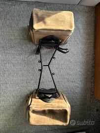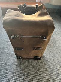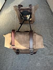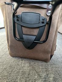 Trattata con cera che la rende resistente all'acqua. Curata nei minimi dettagli con finiture in cuoio da 3 mm,semplice e pura come i materiali con cui è stata costruita. Si aggancia velocemente al nostro telaio portaborsa con il sistema a sgancio rapido applicato sul retro della borsa che è provvisto di serratura per il bloccaggio. Può alloggiare all'interno un computer portatile da 15",è provvista di una capiente tasca con cerniera per telefono e documenti.