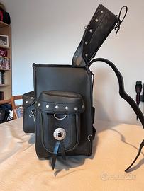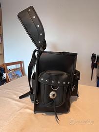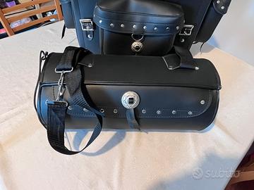 Vendo set di borse per moto stile chopper in vera pelle. Il set comprende una borsa con tasche laterali e un borsone cilindrico da fissare alla moto. Realizzate in vera pelle nera con borchie decorative e chiusure metalliche. Condizioni pari al nuovo, mai utilizzate. Ideali per moto custom, chopper o cruiser. Per ulteriori informazioni o foto aggiuntive, contattare in privato.
