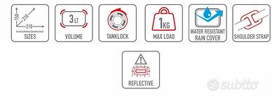 Codice ricambio: XS319Y possibilità di spedizione o ritiro in negozio Borsa borsello “mini” TANKLOCK Givi xs319y xstream ykk Materiali (realizzati secondo la normativa REACH): • Guzy Nylon con inserti in PU. Dotazioni: • Inserti riflettenti • Copertina antipioggia in materiale fluorescente • Maniglia e tracolla per trasporto a mano • Aggancio rapido Tanklock • ZIP di apertura YKK* (marchio registrato) Da abbinare necessariamente alle flange specifiche BF_ _ Il sistema TANKLOCK si compone di una flangia specifica BF_ _ a cui bisogna accoppiare una delle borse TANKLOCK. Prima dell'acquisto verificare attentamente che la borsa non pregiudichi l'originaria guidabilità del mezzo, facendo particolare ad eventuali interferenze con il manubrio.