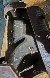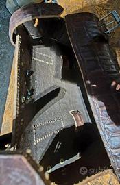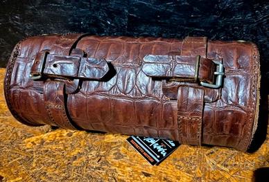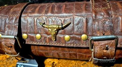 Borsello tubolare moto. In vero cuoio rigido e assemblato artigianalmente. MADE IN ITALY. Dettaglio di un bue dorato sul frontale.