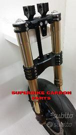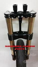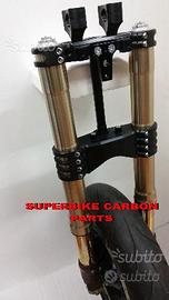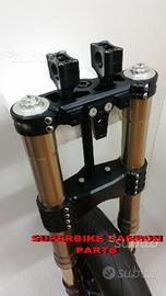 Kit costituito da: piastre di sterzo speciali ricavate dal pieno sovradimensionate con piastra inferiore da 80 mm a 4 punti di chiusura e cave di alleggerimento passanti laterali, con piastra superiore a 2 punti di chiusura e cava di alleggerimento. Biscottino di raccordo per forcelle con piedino assiale, perno ruota. Tutto il kit è assolutamente plug & play ovvero si monta senza modifiche. Per il montaggio si utilizzano boccole e cuscinetti originali. Tutte le parti ricavate dal pieno possono essere anodizzate di qualsiasi colore. Possiamo progettare e realizzare qualsiasi specifica atta a rendere unica tale tipologia di prodotto. Tutte le parti ricavate dal pieno possono essere progettate e realizzate direttamente su specifiche tecniche ed estetiche del cliente. Con i nostri kit potete modificare e/o sostituire l'avantreno di qualsiasi moto e renderla unica. Progettiamo e realiziamo un avantreno completo di tutte le parti. Le forcelle sono appositamente modificate per essere perfettamente compatibili con il tipo di moto. Potete utilizzare qualsiasi cerchio e dischi freno anteriori. Il kit può essere realizzato sia per pinze radiali sia per pinze ad attacco assiale (di cui sono dotate le moto più vecchiotte) o perimetrale (vedi Buell o alcune Harley Davidson). I nostri kit avantreni speciali si montano senza dover effettuare alcun adattamento. Possiamo fornire come optional: cerchi Oz Dymag Pvm, dischi freno brembo, pinze Brembo speciali, parafango carbonio, off set regolabile delle piastre. Progettiamo e Realizziamo avantreni speciali per cafe racer, scrambler, streetfighter, superbike, prototipi.