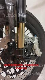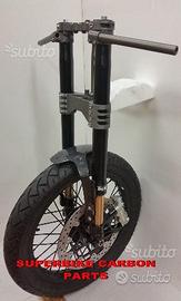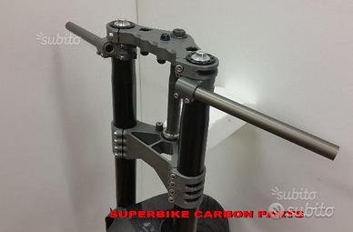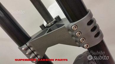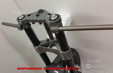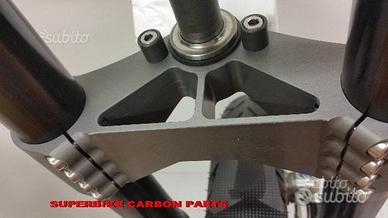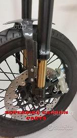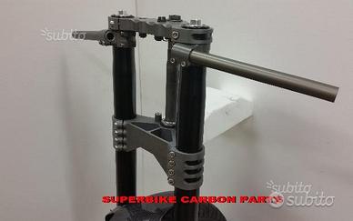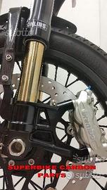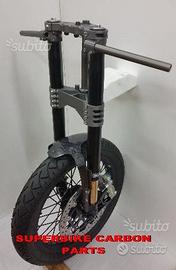 PROGETTIAMO E REALIZZIAMO KIT AVANTRENI SPECIALI COMPLETI CON FORCELLE OHLINS E PIASTRE DI STERZO RICAVATE DAL PIENO. Kit costituito da: Forcelle ohlins modificate a seconda della tipologia di moto, piedini radiali speciali ricavati dal pieno per doppio disco o monodisco, piastre di sterzo speciali ricavate dal pieno e sovradimensionate con piastra inferiore da 60 mm a 3 punti di chiusura oppure 80 mm a 4 punti di chiusura con cave di alleggerimento passanti. Riser o semimanubri a richiesta. Possiamo realizzare attacchi o supporti per blocco accensione, amm. di sterzo, blocca sterzo, strumentazioni etc...Tutto il kit è assolutamente plug & play ovvero si monta senza modifiche ed è progettato specificatamente su richiesta PER QUALSIASI MOTO. Per il montaggio si utilizzano boccole e cuscinetti originali. Tutte le parti ricavate dal pieno possono essere anodizzate di qualsiasi colore. Tutti gli accessori menzionati sono nuovi. Possiamo progettare e realizzare qualsiasi specifica atta a rendere unica tale tipologia di prodotto. Tutte le parti ricavate dal pieno possono essere progettate e realizzate direttamente su specifiche tecniche ed estetiche del cliente. Con i nostri kit potete modificare e/o sostituire l'avantreno di qualsiasi moto e renderla unica.Le forcelle sono appositamente modificate per essere perfettamente compatibili con il tipo di moto. Potete utilizzare qualsiasi cerchio e dischi freno. Il kit può essere realizzato sia per pinze radiali sia per pinze ad attacco assiale o perimetrale (vedi Buell o alcune Harley Davidson). Possiamo fornire come optional: cerchi Oz, Dymag, Pvm, dischi e pinze freno brembo, parafango carbonio, off set regolabile delle piastre. Progettiamo e Realizziamo avantreni speciali per cafe racer, scrambler, streetfighter, superbike, prototipi. Possiamo anche realizzare per qualsiasi moto kit piastre speciali e kit di montaggio (perno ruota , boccole etc) anche per forcelle e cerchi di qualsiasi tipologia, forniti dal cliente.