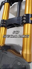 Possiamo progettare e realizzare qualsiasi specifica atta a rendere unica tale tipologia di prodotto. Tutte le parti ricavate dal pieno possono essere progettate direttamente su specifiche tecniche ed estetiche del cliente e anodizzate di qualsiasi colore. Sulle piastre possiamo replicare attacchi e supporti originali per telaietto, quadro strumenti, blocco accensione, blocca sterzo, ammortizzatore di sterzo etc oppure possiamo farne su richiesta.