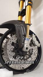 Kit costituito da: Forcelle OHLINS R&T 43 con stelo da 43 mm e fodero da 56mm, le forcelle sono allestite SPECIFICATAMENTE. Le forcelle sono corredate da piedini radiali e pinze BREMBO radiali, piastre di sterzo speciali ricavate dal pieno e sovradimensionate con piastra inferiore da 60 mm a 3 punti di chiusura con cave di alleggerimento passanti. Riser ricavati dal pieno con altezza standard regolabili nel diametro e nella altezza. E manubri ricavati dal pieno per alternare la posizione di guida. Staffe parafango con parafango in carbonio e kit perno ruota ricavato dal pieno.