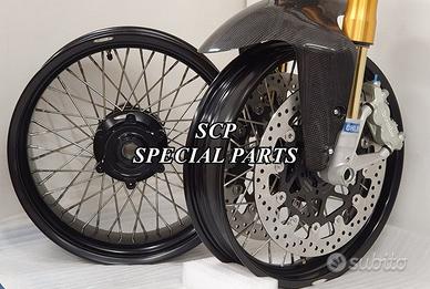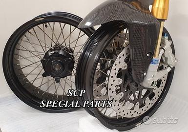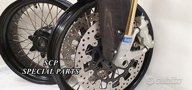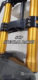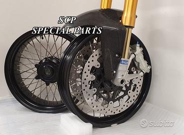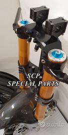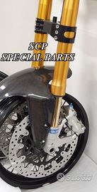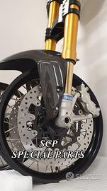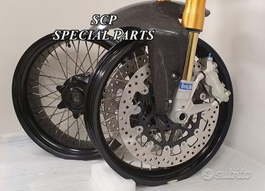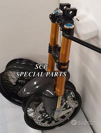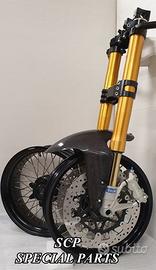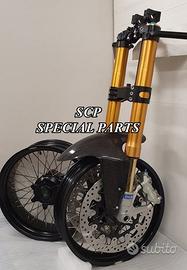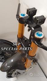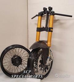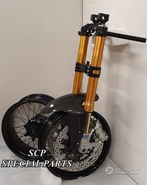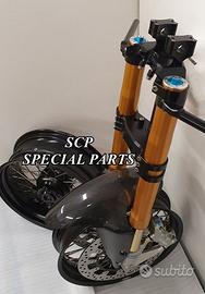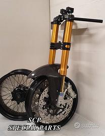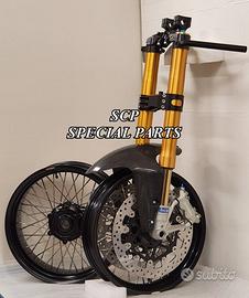 PROTOTIPIAMO E REALIZZIAMO AVANTRENI SPECIALI PER QUALSIASI MOTO. SICUREZZA, PERFORMANCE, ESCLUSIVITA' AL TOP!!! LA FINALITA' DI TALI PROGETTI E' RENDERE UNICA LA VOSTRA MOTO QUALUNQUE ESSA SIA. PRESENTIAMO AVANTRENO COMPLETO PER HONDA HORNET CON FORCELLE OHLINS DA 56mm E STELO DA 43mm, PIASTRE DI STERZO RICAVATE DAL PIENO SPECIALI CONVERTIBILI DA USARE A SCELTA CON SEMIMANUBRI O RISER NAKED, PIEDINI RADIALI, PINZE BREMBO RADIALI E CERCHI A RAGGI CON DISCHI BREMBO MAGGIORATI DA 320mm. IL KIT E' PLUG AND PLAY! SPECIFICO! SI MONTA SENZA NESSUNA MODIFICA! SI PUO MANTENERE ANCHE IL CERCHIO ORIGINALE HORNET. Kit costituito da: Forcelle OHLINS R&T 43 con stelo da 43 mm e fodero da 56mm, le forcelle sono allestite SPECIFICATAMENTE. Le forcelle sono corredate da piedini radiali e pinze BREMBO radiali, piastre di sterzo speciali ricavate dal pieno e sovradimensionate con piastra inferiore da 60 mm a 3 punti di chiusura con cave di alleggerimento passanti. Riser ricavati dal pieno con altezza standard regolabili nel diametro e nella altezza. E manubri ricavati dal pieno per alternare la posizione di guida. Staffe parafango con parafango in carbonio e kit perno ruota ricavato dal pieno. Per il montaggio si utilizzano boccole e cuscinetti originali. I cerchi sono su misura da 17"a raggi con dischi brembo da 320mm. Ma si può mantenere anche il cerchio originale. Possiamo progettare e realizzare qualsiasi specifica atta a rendere unica tale tipologia di prodotto. Tutte le parti ricavate dal pieno possono essere progettate direttamente su specifiche tecniche ed estetiche del cliente e anodizzate di qualsiasi colore. Sulle piastre possiamo replicare attacchi e supporti originali per telaietto, quadro strumenti, blocco accensione, blocca sterzo, ammortizzatore di sterzo etc oppure possiamo farne su richiesta. Optional: cerchi a raggi su misura oppure forgiati a razze, cerchi Oz, Dymag, Pvm, dischi e pinze brembo, off set regolabile delle pia