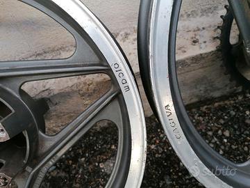 Per Cagiva 125 Aletta Oro S1-S2, vendo coppia di cerchi originali , marchiati OSCAM- CAGIVA, colore grigio canna di fucile/ bordo lucido alluminio, usati ma in buone condizioni generali.