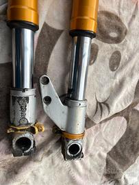 Condizioni buone, le forcelle sono dritte ed hanno steli perfetti, i foderi hanno dei graffi visibili in foto, l’ammortizzatore non ha perdite, soltanto i segni del tempo. Forcelle 250€ complete di poastre Ammortizzatore 80€