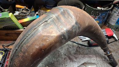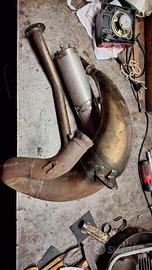 Vendo camera espansione marmitta + silenziatore Giannelli per Aprilia MX SX, con motore Rotax 122. Camera con ammaccatura sulla pancia, come da foto.