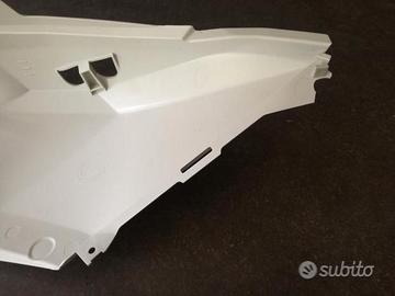 Carena posteriore sinistra bianco perlato originale Peugeot Satelis 125-250-400-500. Nuova, unica imperfezione evidenziata in foto 10/14. Prezzo di listino 234,00€.