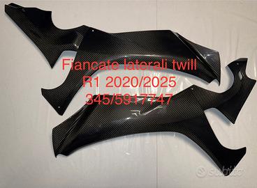 Disponibili pronta consegna i seguenti pezzi in foto in piu fianchetti carena - fianchetti laterali frontale - copricatena - sotto codone - copricarter e ali tutti in vero carbonio realizzati in autoclave con trama twill per yamaha R1 dal 2015 al 2025.