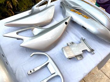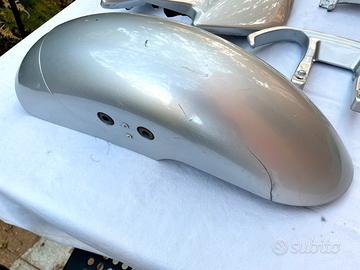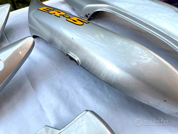 KIT CARENE COMPLETE PER KAWASAKI ER-5 COMPOSTO DA: FIANCO DESTRO, FIANCO SINISTRO, CENTRALE, MANIGLIONE PASSEGGERO, FIANCHETTO DESTRO, FIANCHETTO SINISTRO, PARAFANGO. Le carene sono di colore grigio e in buone condizioni. Presente una crepa sul parafango e su uno dei supporti di un fianco. Chiedetemi altre info o foto per messaggio.