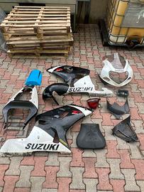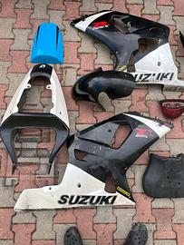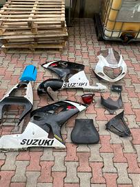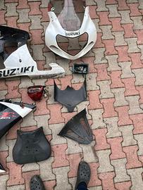 Set Carene Complete Suzuki GSX-R (Modello SRAD)Livrea Bianco/Nero/Rosso – Originali / Post-vendita Descrizione del Prodotto: Vendo kit completo di carene per Suzuki GSX-R (compatibile con serie SRAD 600/750 anni fine '90). Il set è ideale per chi desidera ripristinare una moto da pista, personalizzare il proprio modello o come pezzi di ricambio per un restauro. Il kit include: Cupolino anteriore bianco con logo Suzuki e parabrezza trasparente incluso. Carenature laterali (Destra e Sinistra) con grafiche Suzuki e loghi Michelin/GSX-R.Codone posteriore bicolore (bianco/nero). Coprisella passeggero (monoposto) in colore azzurro a contrasto. Sella pilota nera originale. Parafango anteriore nero lucido. Componenti aggiuntivi: Fanalino posteriore rosso, sottocodone e plastiche interne nere. Stato dei componentiLe carene sono usate e presentano normali segni di usura e alcuni graffi superficiali dovuti all'utilizzo, ma sono integre nei punti di fissaggio principali. Non presentano rotture strutturali evidenti, rappresentando un'ottima base per una rinfrescata di vernice o per l'uso immediato su una moto da battaglia/pista. Dettagli LogisticiCondizioni: "Viste e piaciute" nello stato attuale.Ritiro: Disponibile per il ritiro a mano presso la nostra sede operativa a Ponte San Nicolò (Padova).